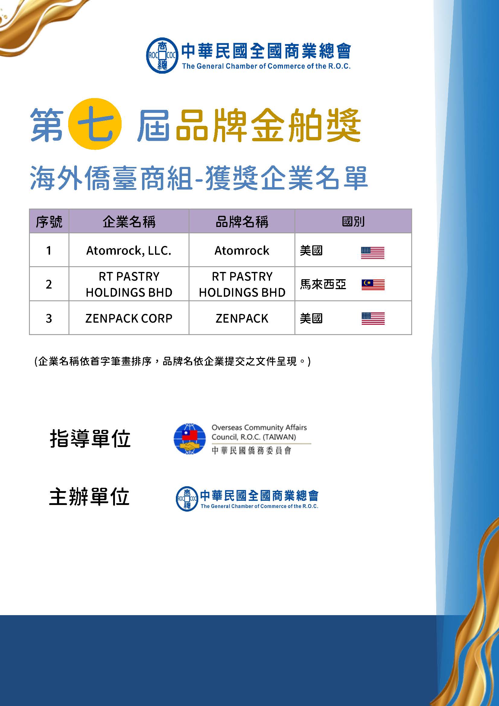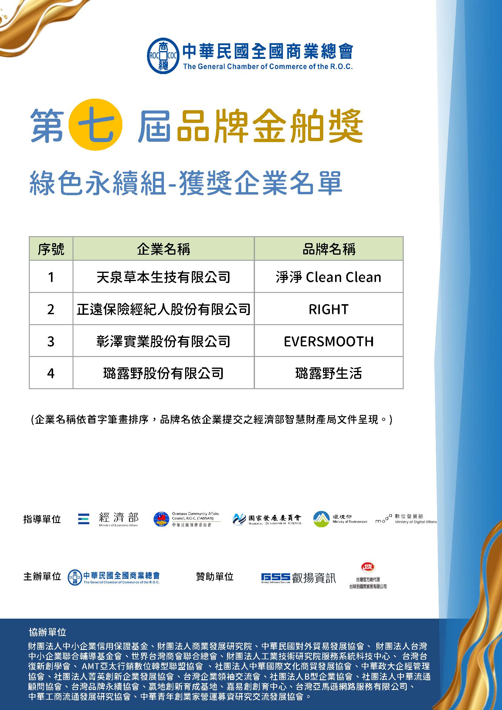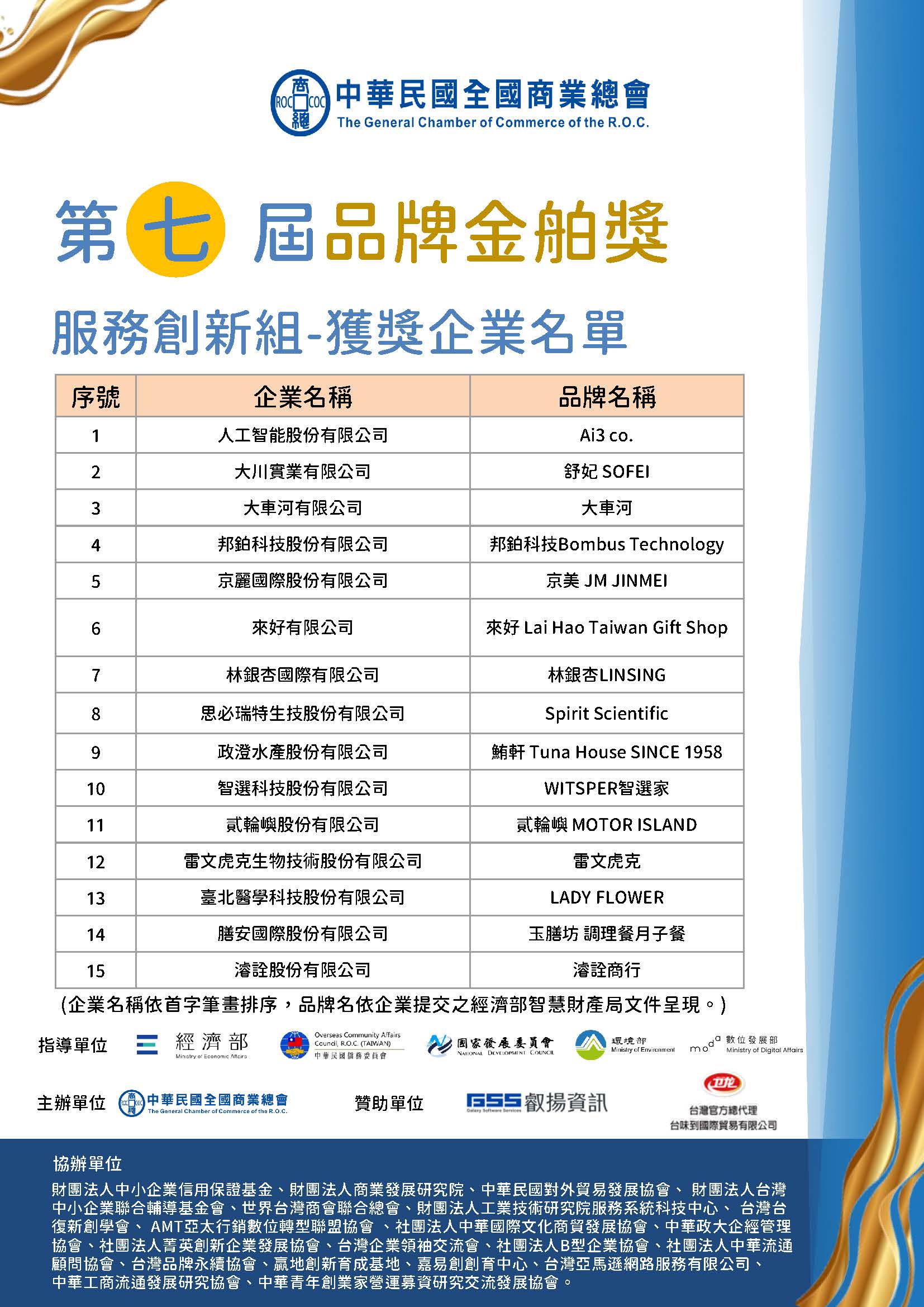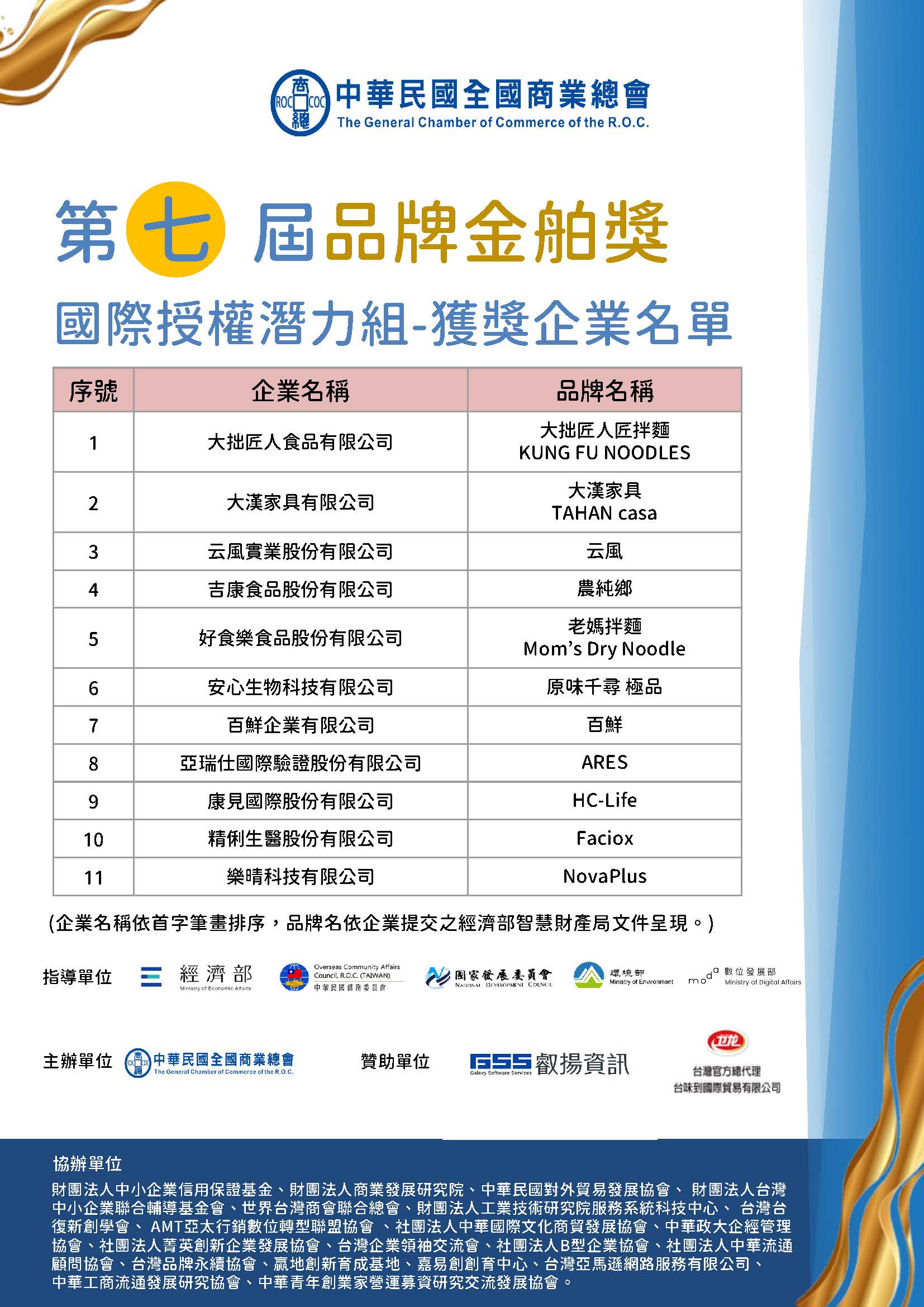 恭喜所有獲獎企業,成功從眾多競爭者中脫穎而出,以下為第七屆品牌金舶獎獲獎企業名單: